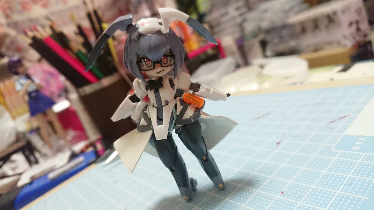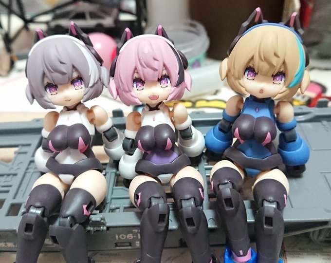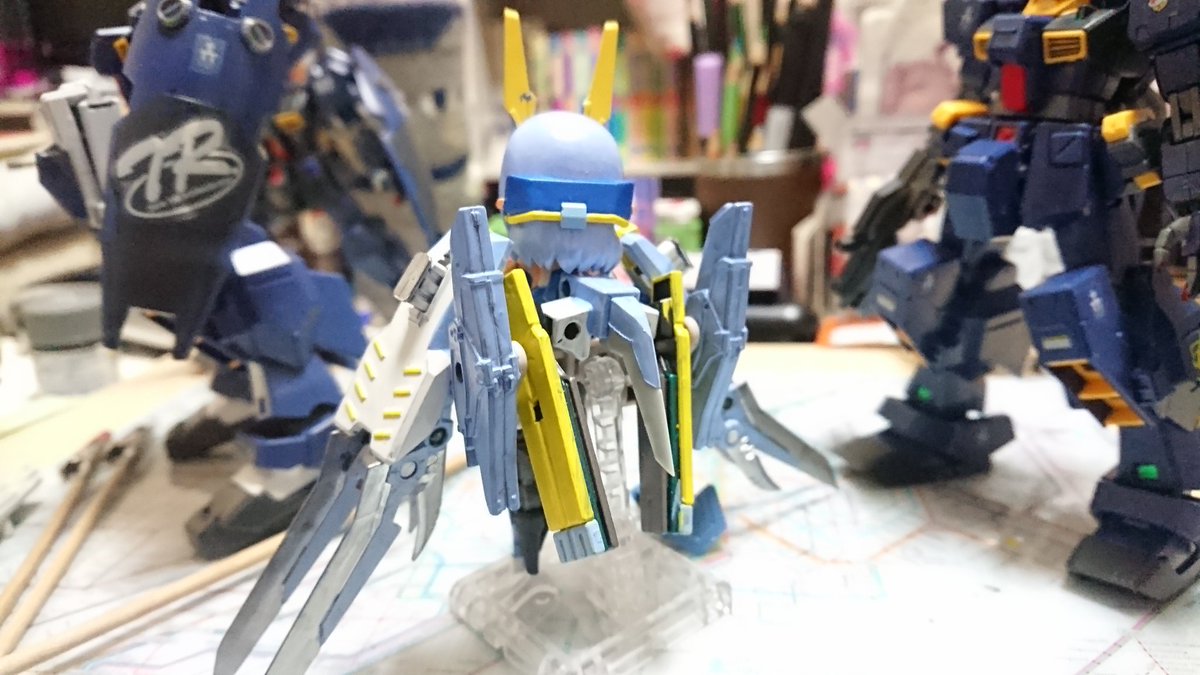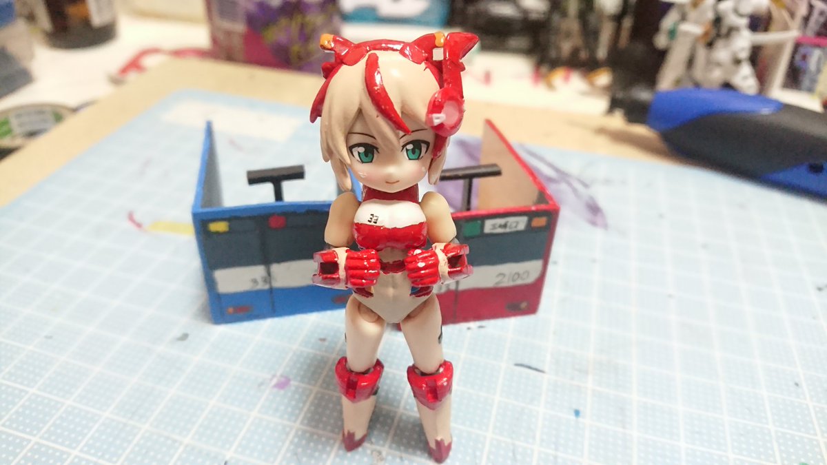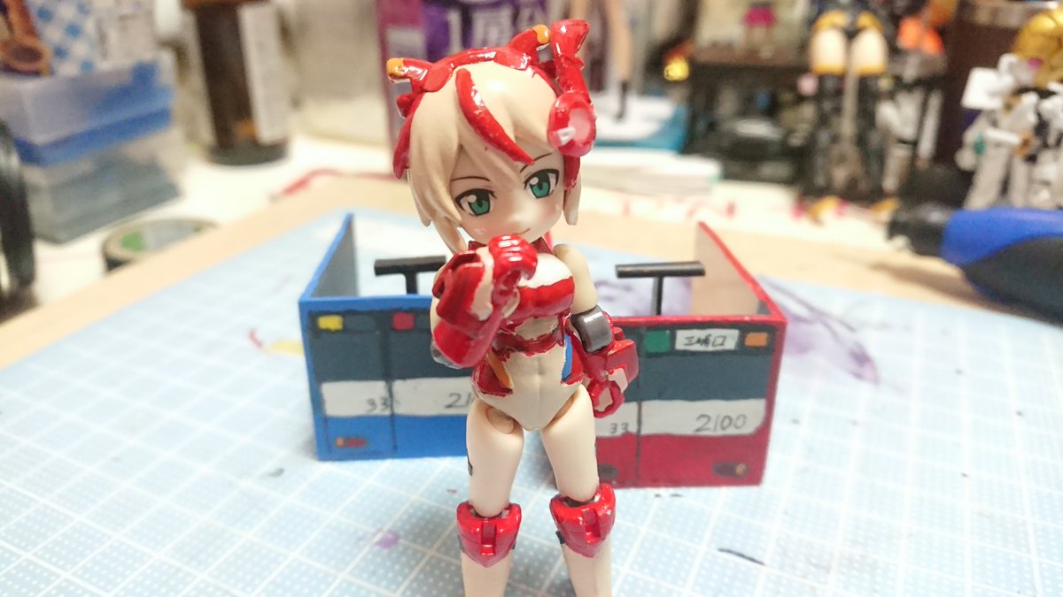 #デスクトップアーミー 未完成ですが… 名前:未定(明日決定) モチーフ:東京メトロ東西線05系24編成(AL車) 特徴:モチーフにした車両同様『リサイクル』を掲げ、有り合わせのパーツとメガミデバイスのジョイントパーツをいい感じ(ここ適当)に再利用し作り上げました