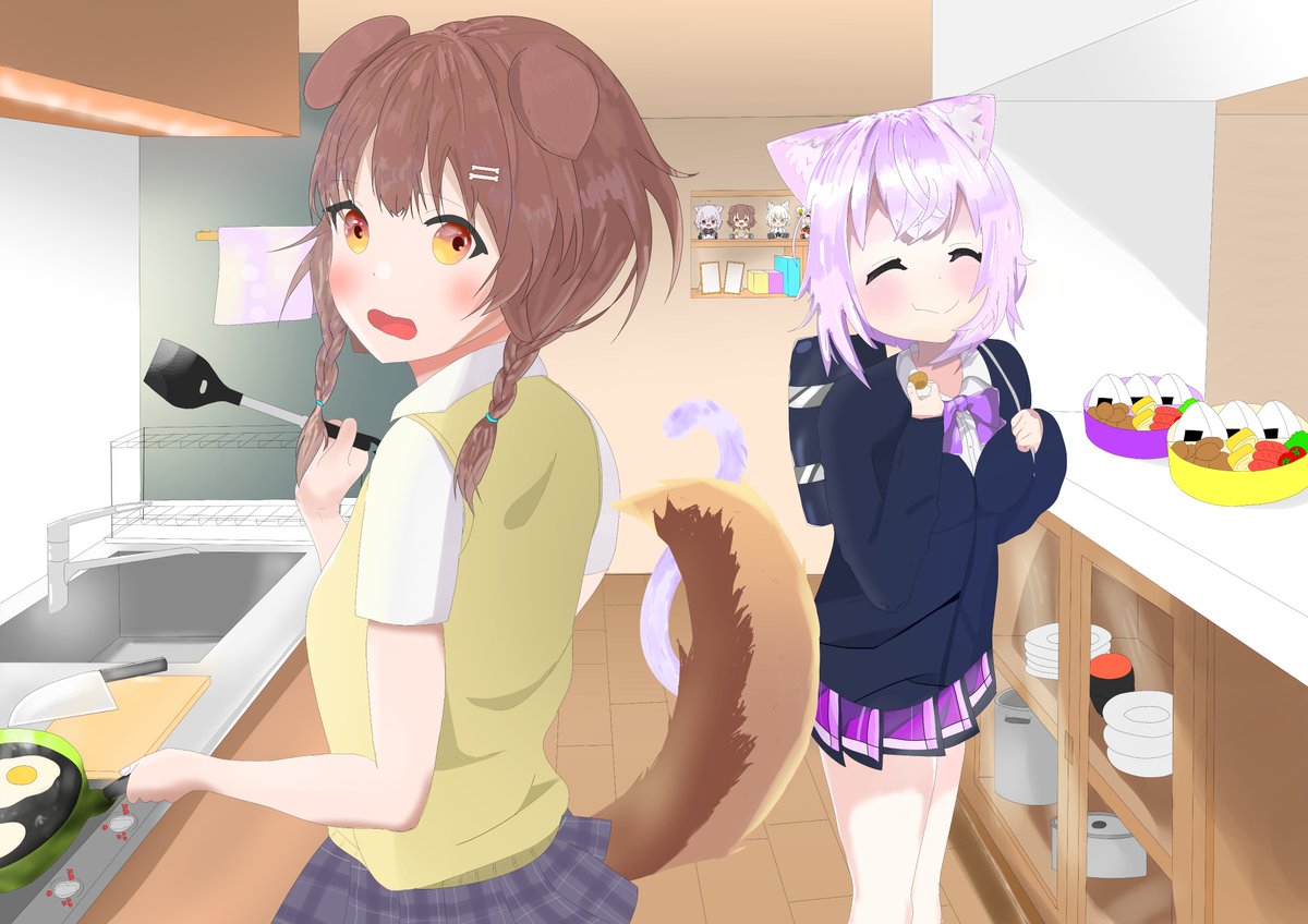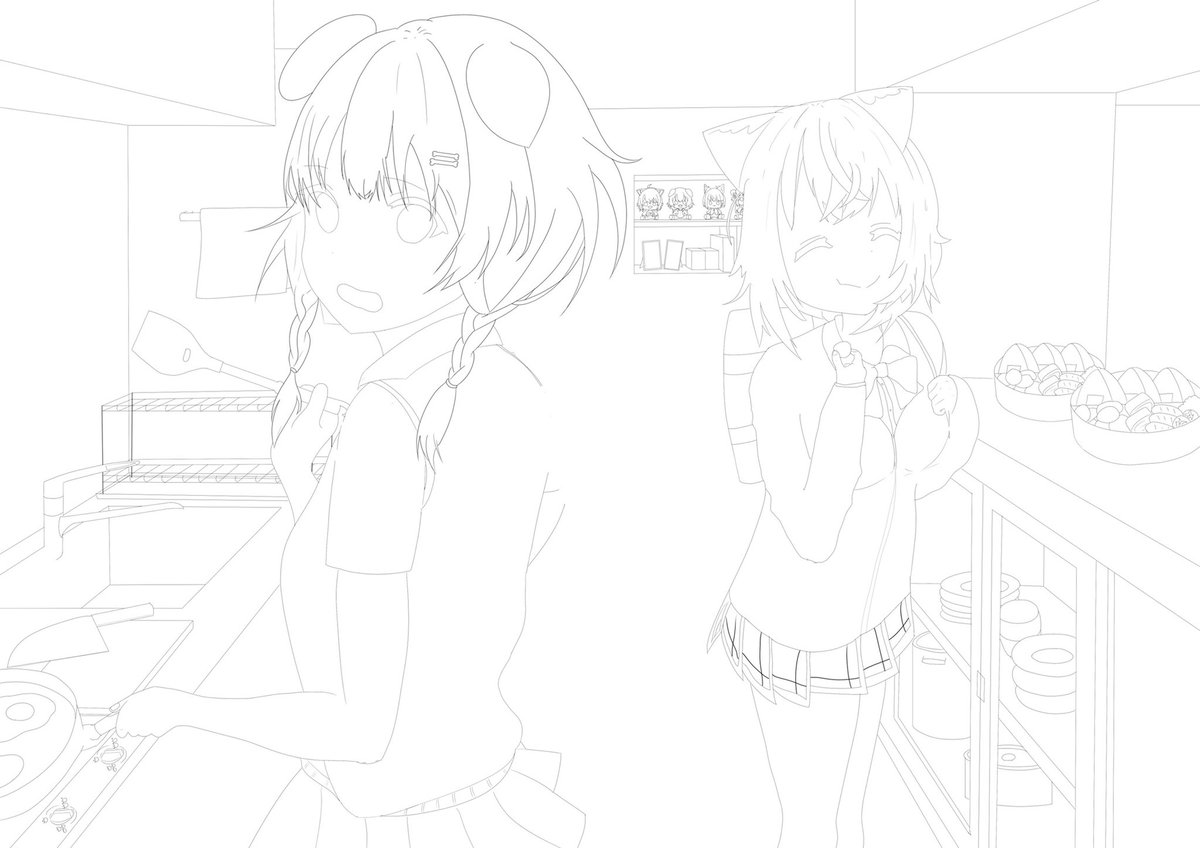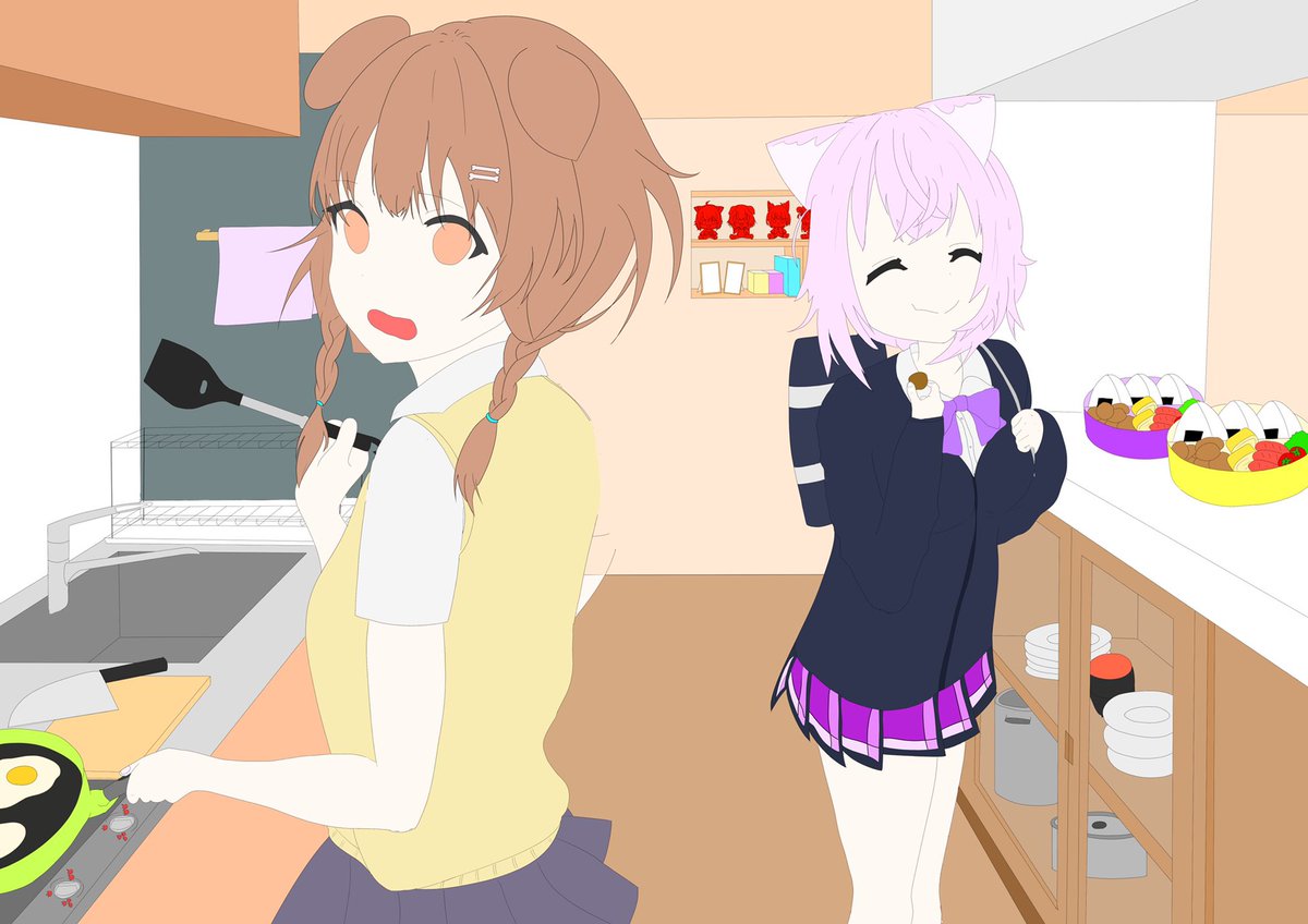 #できたてころね #絵かゆ 素人大学生には今日これしか進捗を生み出せないのか…?(遠い目) プチドルは流石にトレスだけどかわいいから許して。 進捗:水回りの品々の追加、食器棚の中身(クソ雑)、後ろのプチどる・小物たち、その他細かい修正。 twitter.com/AKiHiYoRi307…