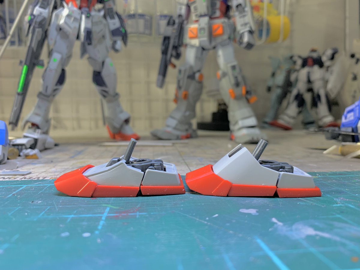 ストームブリンガーWIP スリッパはつま先平なのに甲が高いので角度を寝かせてます。 アンクルガードは合わせ目隙間があるので裏の軟プラカットし、合わせ目はムニュして埋めました😆 #ガンプラ