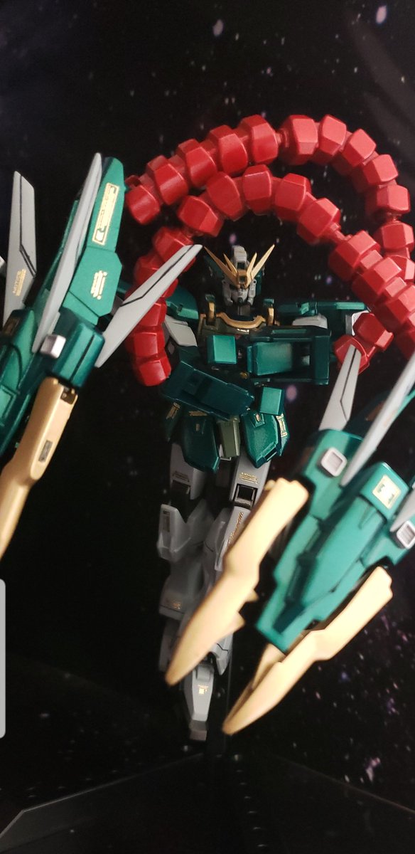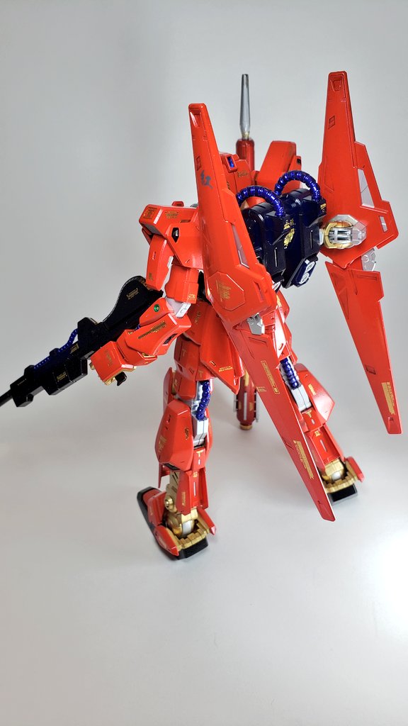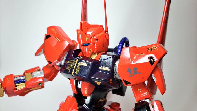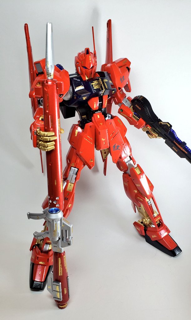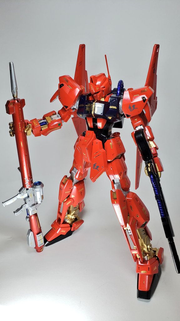 紅式 完成しました! #ガンプラの画像貼るとRTされると聞いて #ガンプラ 百式の機体カラーを金色から赤を基調としたカラーリングに変更しました。 フレームはメタリックにし、光沢仕上げにしています。 ロング・レンジ・ライフルは試作4号機のものをベースに製作しました。 他の写真はリプ覧に↓