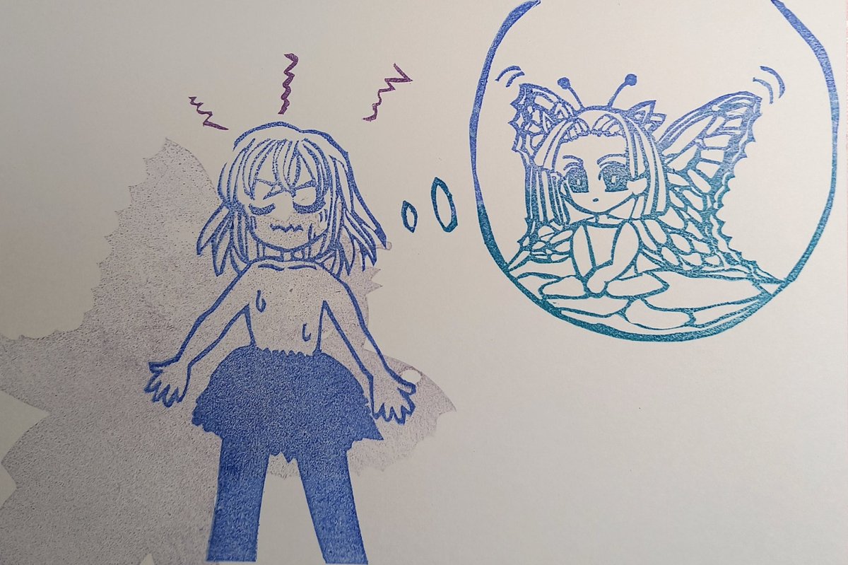 #伊アオ版深夜のお絵描き60分一本勝負 お題:羽化 所要時間:60分 アオちが羽化して蝶になる?! そんな夢でうなされる🐗のもとに不思議な影が… ん?蝶にツインテール?! 今回も開催ありがとうございます