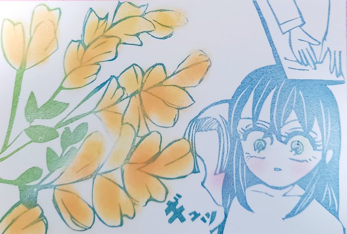 #伊アオ版深夜のお絵描き60分一本勝負 お題:金雀枝(えにしだ) 所要時間:75分 きれいに咲き誇る金雀枝を眺めてると、ふいにアオちが🐗の手を握る🤭 ふいうちに🐗もびっくり 今回も開催ありがとうございます