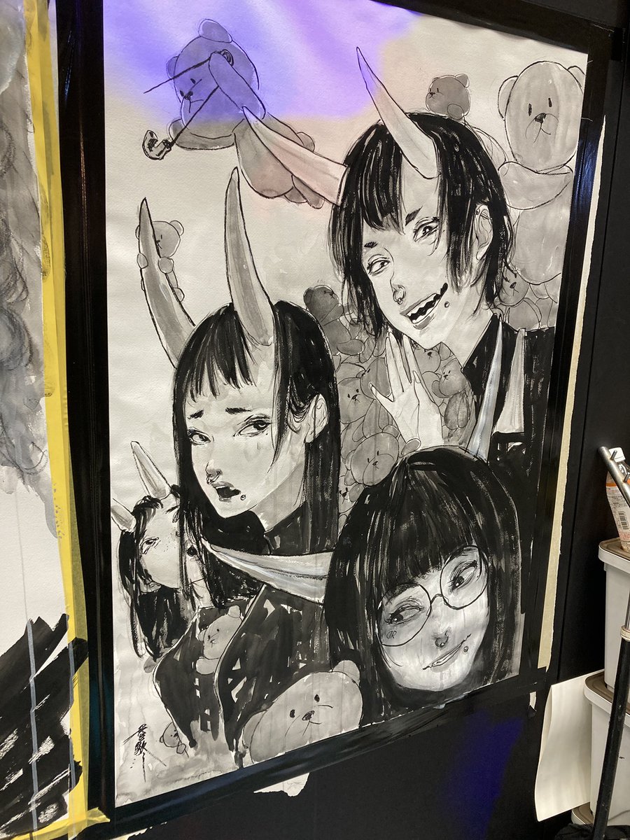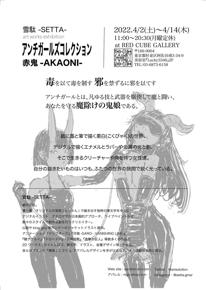 雪駄のブランド【ANTI PAIN】そのイメージキャラクター達をモチーフにした企画展「アンチガールズコレクション 赤鬼-AKAONI-」4月2日から阿佐ヶ谷レッドキューブギャラリーにて始まります。観に来てね!!!! #アンチガールズコレクション