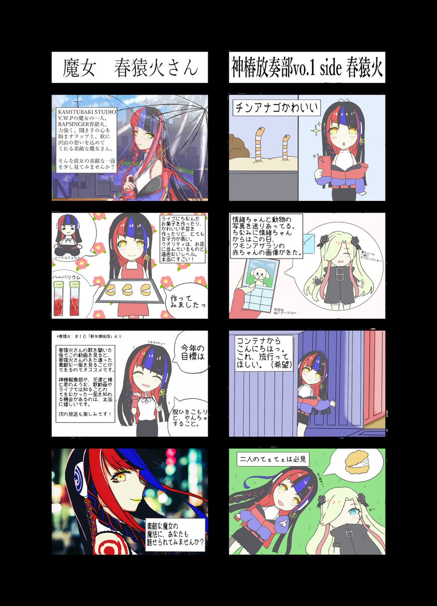 #KAMITSUBAKI_STUDIO #春猿火美術部 #春猿火 力強く聞き手の心に寄り添うようなラップと高音も低温もとても綺麗に歌われるV.W.Pの魔女、春猿火さん。 春猿火さんのオリジナル曲の「告げ口」を初めて聞いたときは比喩やお世辞ではなく本当に涙が出てきていました。私も素敵な傘をもらいました。