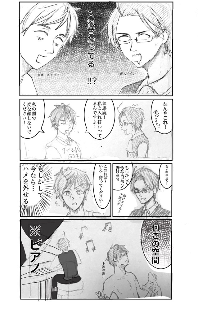 25 140 #APHワンドロ版深夜創作60分一本勝負 @Hetalia_1daw ふつうに間に合わんかったわ〜… はぷすで入れ替わり 久しぶりに参加した… 18/07/28 23:32
