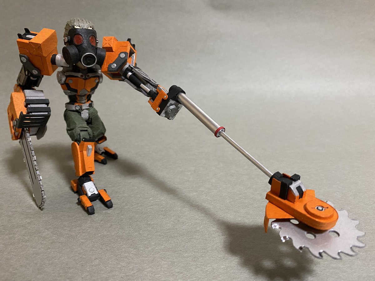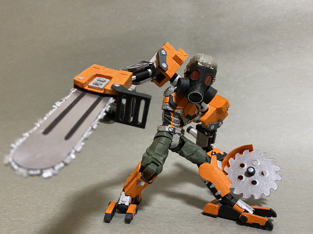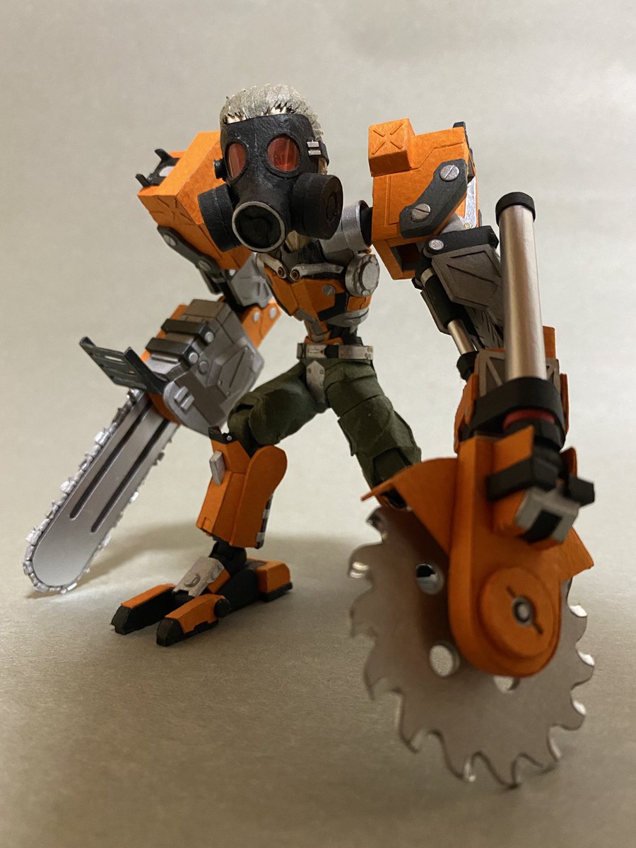25 75 #ペーパークラフト 「花粉症さん」完成。 身長13cm、全身39カ所可動(芝刈り機の伸縮含まず)。 この世か、スギ、ヒノキ、イネ、ブタクサを抹消するため肉体改造。 二度とティッシュで鼻がかめない身体に。 ガスマスクは必需品。 そんなイメージ。 素顔や別アングルはリプ欄に。 ↓ 22/03/06 18:37