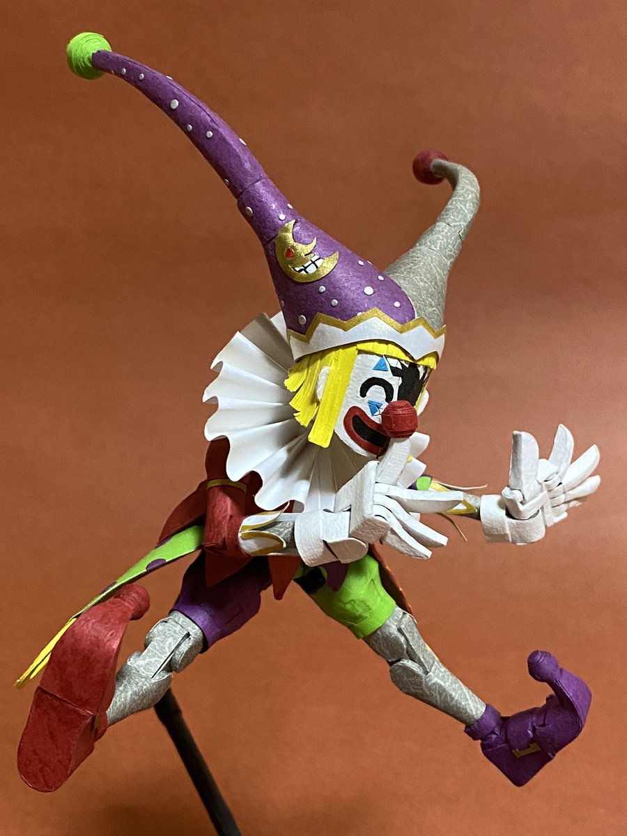 #ペーパークラフト 完成。「堪え性さん」。 身長13㎝、(衣装を含め)52ヶ所可動。 『みんなを笑顔にするために わたしが笑顔でいなければ』 とある小話に登場する「ピエロのパリアッチ」 日野日出志さんの怪奇漫画「笑い転がし」 からイメージ。