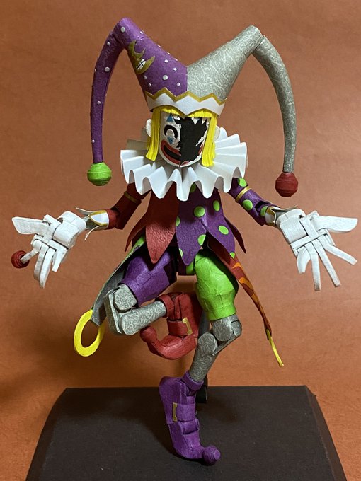 17 65 #ペーパークラフト 完成。「堪え性さん」。 身長13㎝、(衣装を含め)52ヶ所可動。 『みんなを笑顔にするために わたしが笑顔でいなければ』 とある小話に登場する「ピエロのパリアッチ」 日野日出志さんの怪奇漫画「笑い転がし」 からイメージ。 23/02/05 19:14