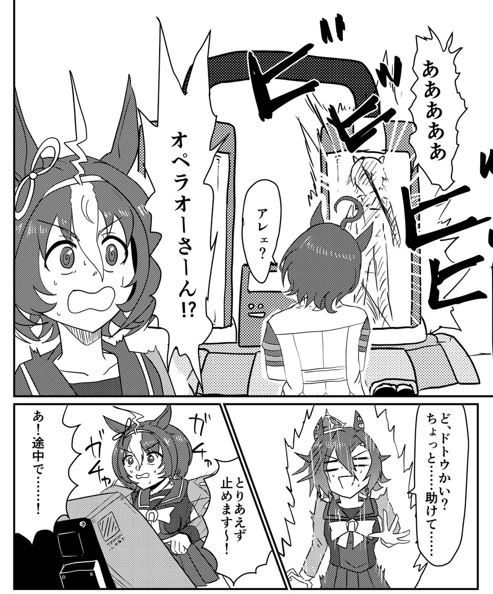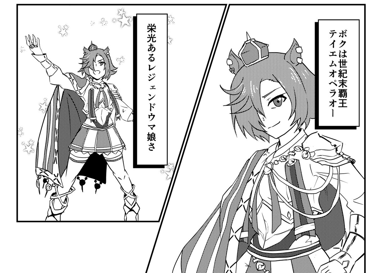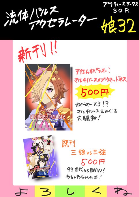 【お品書き&新刊サンプル】 プリティーステークス30Rにて、 新刊『テイエムオペラオー:マルチバースオブウマッドネス』 を頒布いたします! ゲーム時空、アニメ第1期時空、初期PV時空のテイエムオペラオーがひょんなことから集まってしまい…? 既刊もあります!よろしくお願いします #プリステ30R
