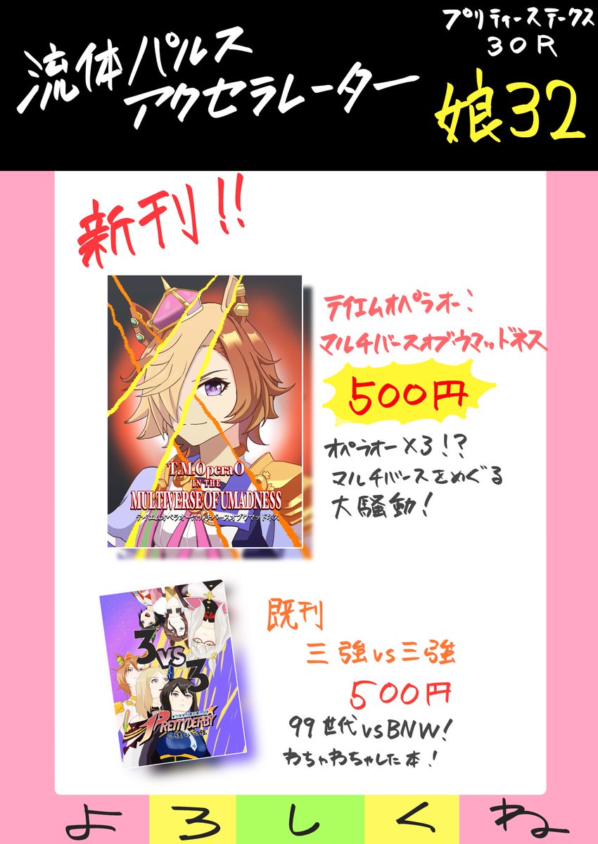 28 31 夏コミの告知!!! 1日目 東ケ 18b 流体パルスアクセラレーター 新刊「桜花爛漫」頒布します! レースから一戦を退いたオペラオーが未だ現役で走るハルウララと再会し……? その他既刊もあります!よろしくお願いします!! #C102 #C102お品書き #C102告知 23/08/07 23:08