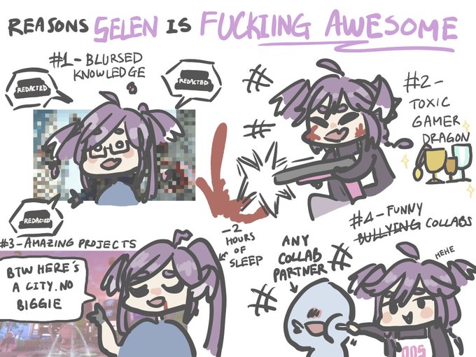 #Artsuki #SelenBday2022 Some of the many many reasons Selen is FUCKING AWESOME!!! Happy Birthday funni purple dragon you kick so much ass and here's a toast to your continuous success in the future 🥂🏆💜