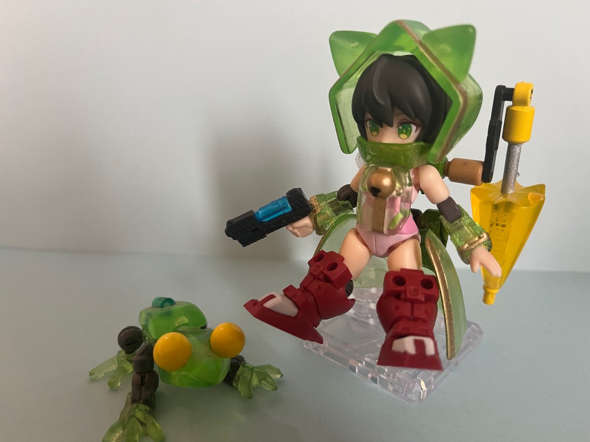 #デスクトップアーミー UVレジンを使って雨ガッパ風の装備を作ってみました。 コートとかパーカーとかフード付きの服ってなんかかわいいですよね。 長靴をイメージしてタイタスのゴツい足を付けてみましたが、長靴…にはちょっと見えないかなぁ…