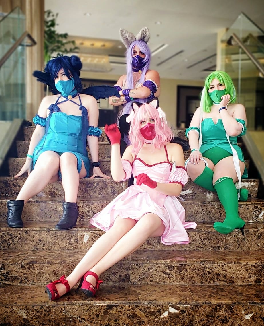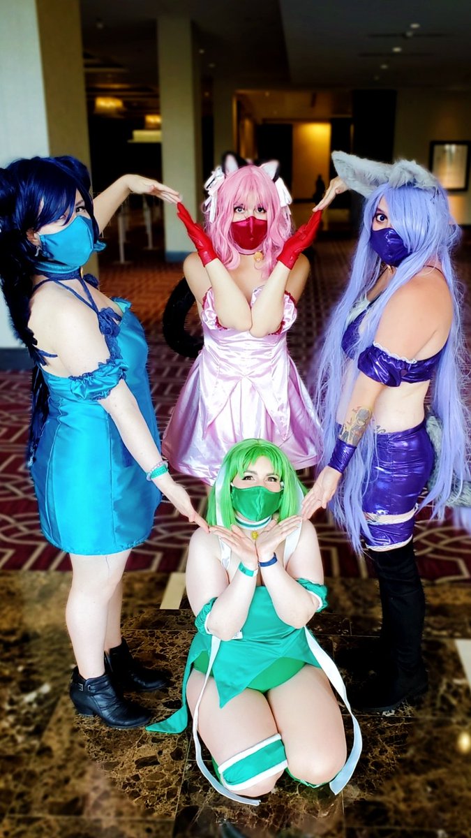Saving the world, one nyaa at a time~! 💖: @/breathofbeth (ig) 💙: @/frankenpiggy (ig) 💜: @/nightmare_missy (ig) 💚: Me! #cosplay #tokyomewmew #mechacon2021 #mechaconomega
