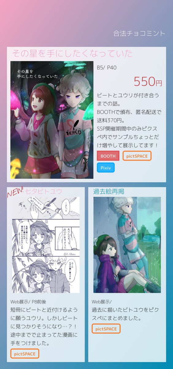 チャレ!20新刊サンプル その星を手にしたくなっていた(1/3) 付き合うまでのビトユウのお話です。 B5/40p/イベント頒布価格500円(予定) pixivのサンプルはこちら→ pixiv.net/artworks/84575…