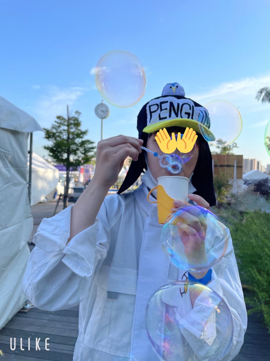 ⚠️腕まくり・あごマスク注意 シャボン玉してる時のペンギンを友達がいい感じに撮ってくれてました✨✨ 帽子のペンギン着脱可能なんですけど、色んな人にちぎってもらえて良かったです☺️ #倉コス