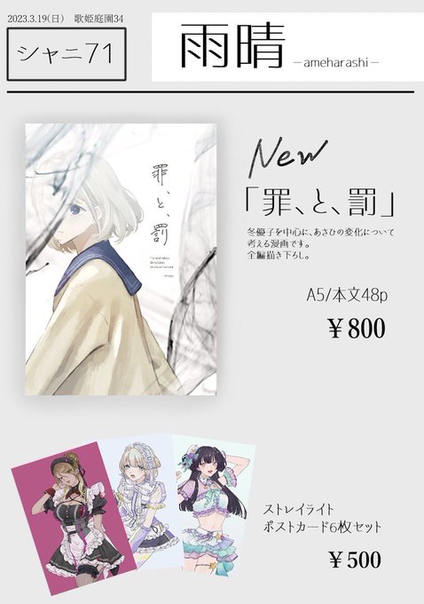 3/19(日)に開催される #歌姫庭園34 のお品書きです! あめぱからは新刊を1つ、 売り子として来てくださる吉乃さん(@yo________05 )からはストレイライトのポストカード6枚セットを頒布します! 当日はよろしくお願いします🤲