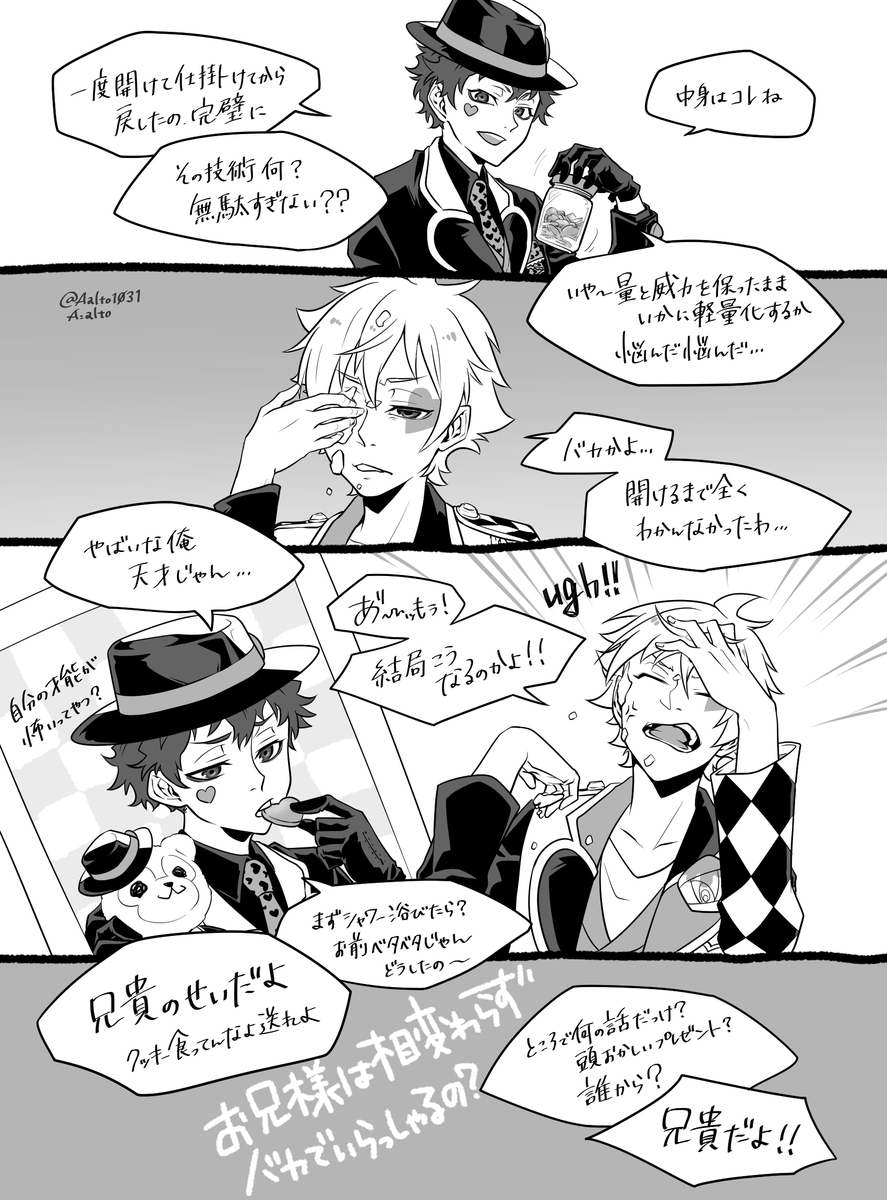 ざっくりですがタイミング逃したくないので急いで描いたトラポ。 前回のバラの花を赤く塗るだけのお話から繋がっているかも知れない。 #altoのトラッポラ兄弟_仮 #altoのクロスオーバー