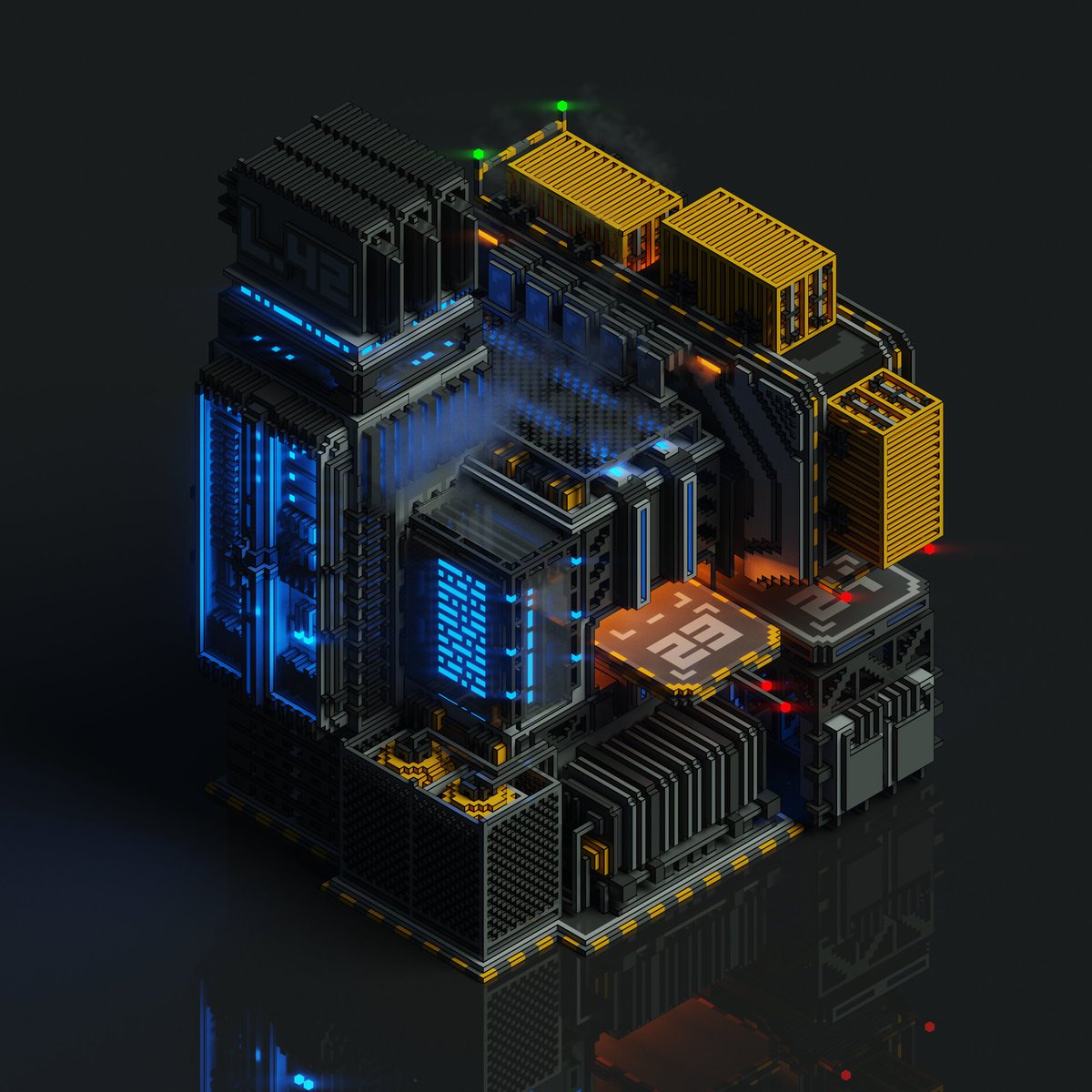 Container facility made with #magicavoxel for the "Voxel of Titan" collaboration on @MVC_discord | #voxel #voxelart #3d #3drender #isometric #cyberpunk #factory #building