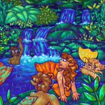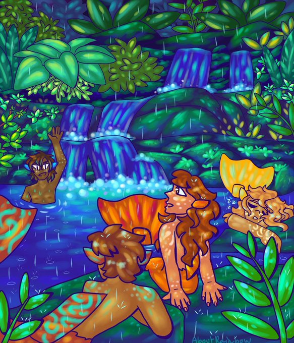Day two of #aboutrainbowsmermay2022; Discus!! Here’s a group of friends hanging out in a soft jungle shower. 🌿🌧 I’m super proud of this. I’d love to hear what y’all think! #Mermay #Mermay2022 #Thisisatagforartists #ArtistonTwitter
