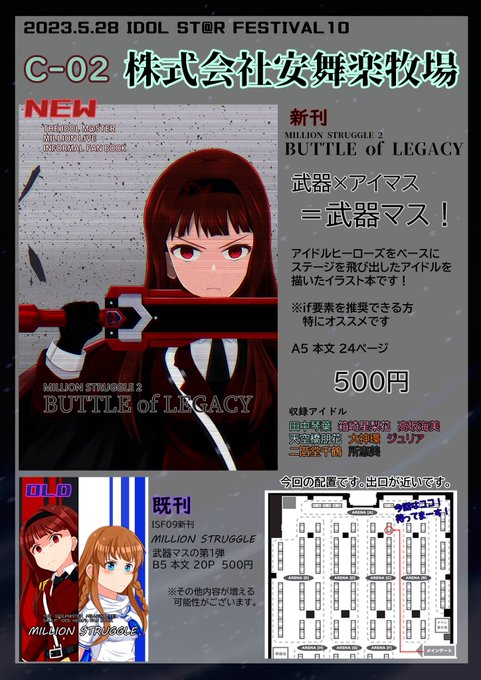 4 5 こちらにも投稿させていただきます! 【お品書き】 5/28(日)に横浜マリネリアで開催のISF10に(株)安舞楽牧場出ます!1週間後です! 武器×アイマス=武器マスのイラスト集出します! スペースはC-02! #ISF10 23/05/22 22:28