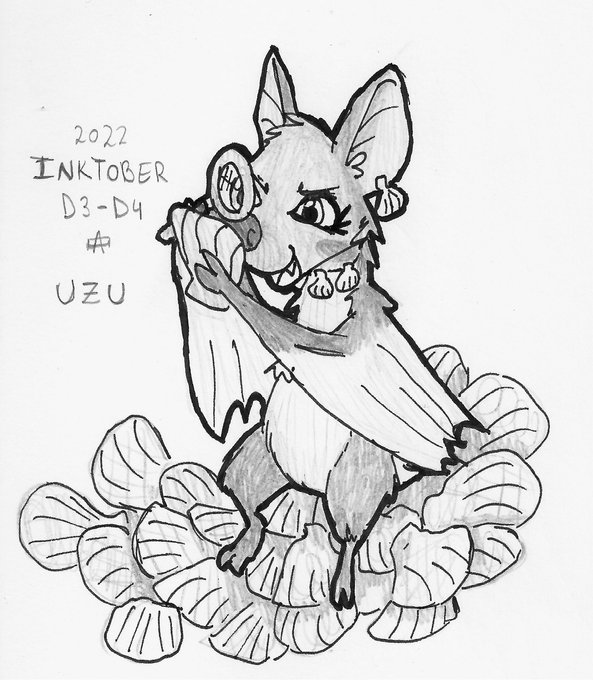 Day 3: bat. Day 4: scallop (clam). Here is a bat that likes to collect scallops. ------------------ #inktober #inktober2022 #traditionalart #traditionaldrawing #pencil #pencildrawing #inked #originalcharacter #drawing #draw #dibujo #dibujotradicional #lapiz