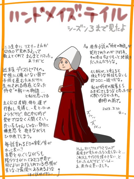 1 2 『ハンドメイズテイル』見たよって日記。何書いてもネタバレになりそうで怖いので、あまり感想書けないね。御目の前で。 #あー日記 #絵日記 23/03/30 17:04