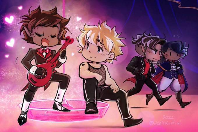 Haven’t done a crossover cosplay picture in a while. Mann as Moxxie, since he can play the guitar, Lucky as Millie, Kevin as Blitzo and Andrew as Stolas, because it’s Andrew—he would want the most fabulous outfit with the space cape. #crossover #cosplay #HelluvaBoss
