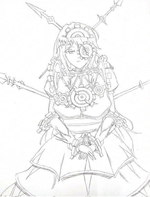 #今日の落書き 作画のムズさに定評のある エポシェナ・A・シンフォニー 他のML民宅にはロボットやら何やらいらっしゃるけど、うちにはこれくらいしか…() ちなみにこの子は人間の様な機械ではなく、機械の一部になった人間…笑