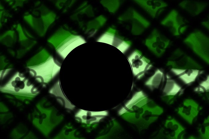 A supermassive black hole gazed upon through a trellis, a green glow: verdant, or sickly? My new piece "Font of death, font of life". #art #digitalart #digitalpainting #painting #blackhole #supermassiveblackhole #spaceart #scifiart #scifi