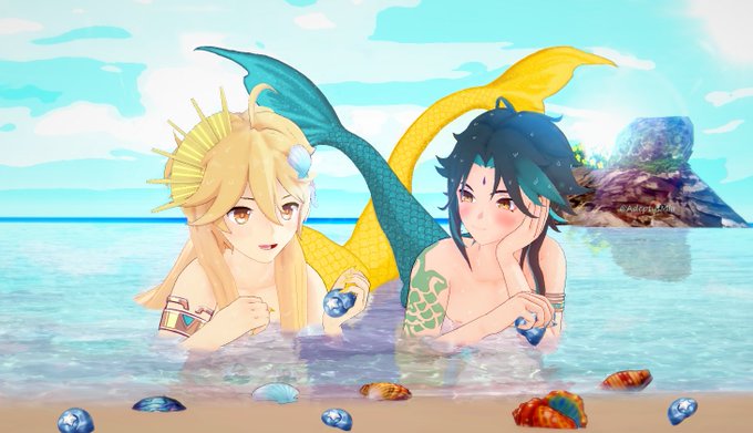 Xiao and Aether relax on the beach collecting seashells and listen to the secrets of the starconches on the shore 💚💛 #mermay2022 #xiaoaether #xiaoae #xiao #aether #xiaother #魈空