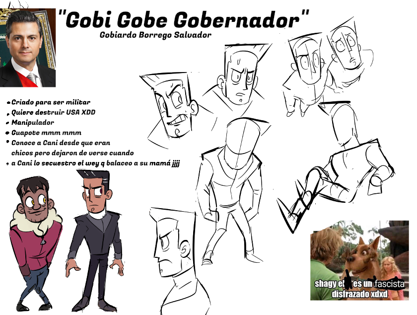 Aqui esta el concepto de Gobi Gobe, lo diseñe hace pocos dias pero ya llevaba mucho tiempo con la idea del personaje xd solo pensaba que debia ser un peña nieto inteligente