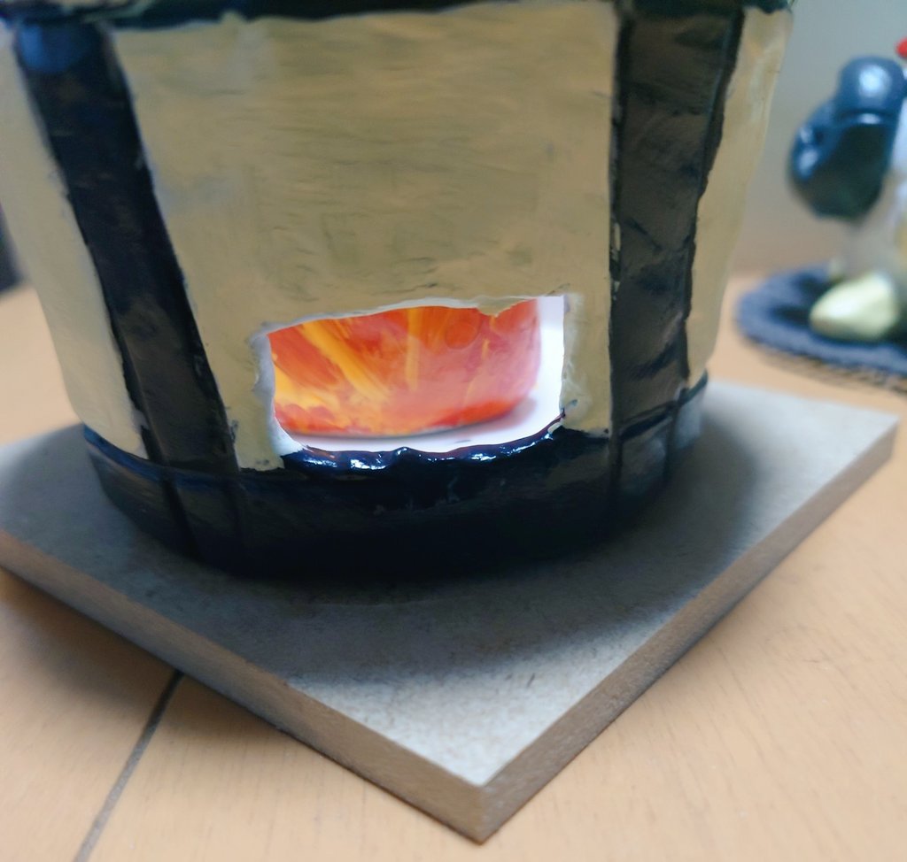 #つのまきあーと わためぇのお片付けを聴きながら、七輪の色塗り塗り🖌️ わためいとを支える柱も炎ぽく塗ったけど見えてないし、やっぱり色塗り下手だなぁ(´ . .̫ . `)乾いて落ち着いたら修正せねばならぬ💦 でも色塗った方が七輪ぽくなるね🤔🤔