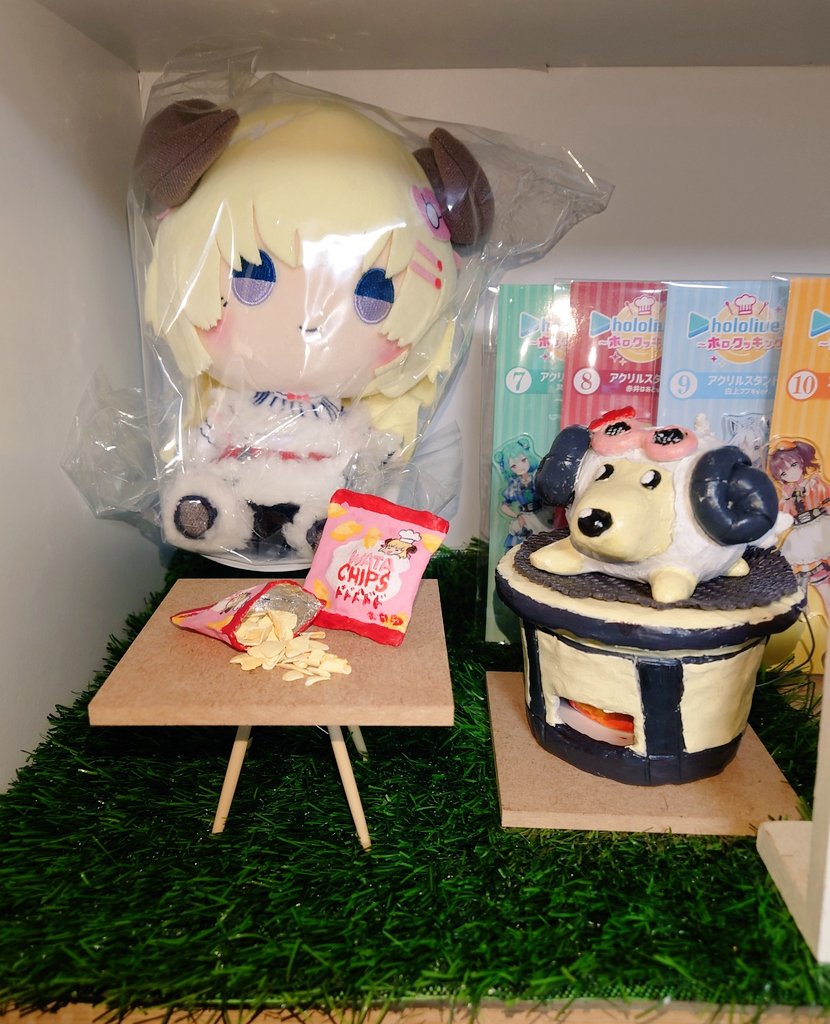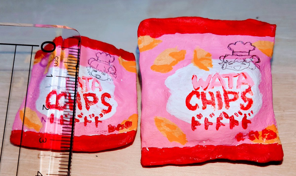 #つのまきあーと わためぇの超絶生誕祭からメン限まで観たテンションで色塗りしたワタチップスver.2と鶏ぽんさん👍 ワタチップスは文字を油性マジックと爪楊枝で前回よりハッキリクッキリ🫡 あーポテチの中身造ってない…コック帽わためぇ塗るのは明日かな🤔 次こそはマチもちゃんと造れる様に頑張る💪