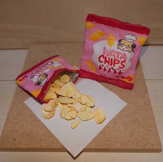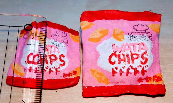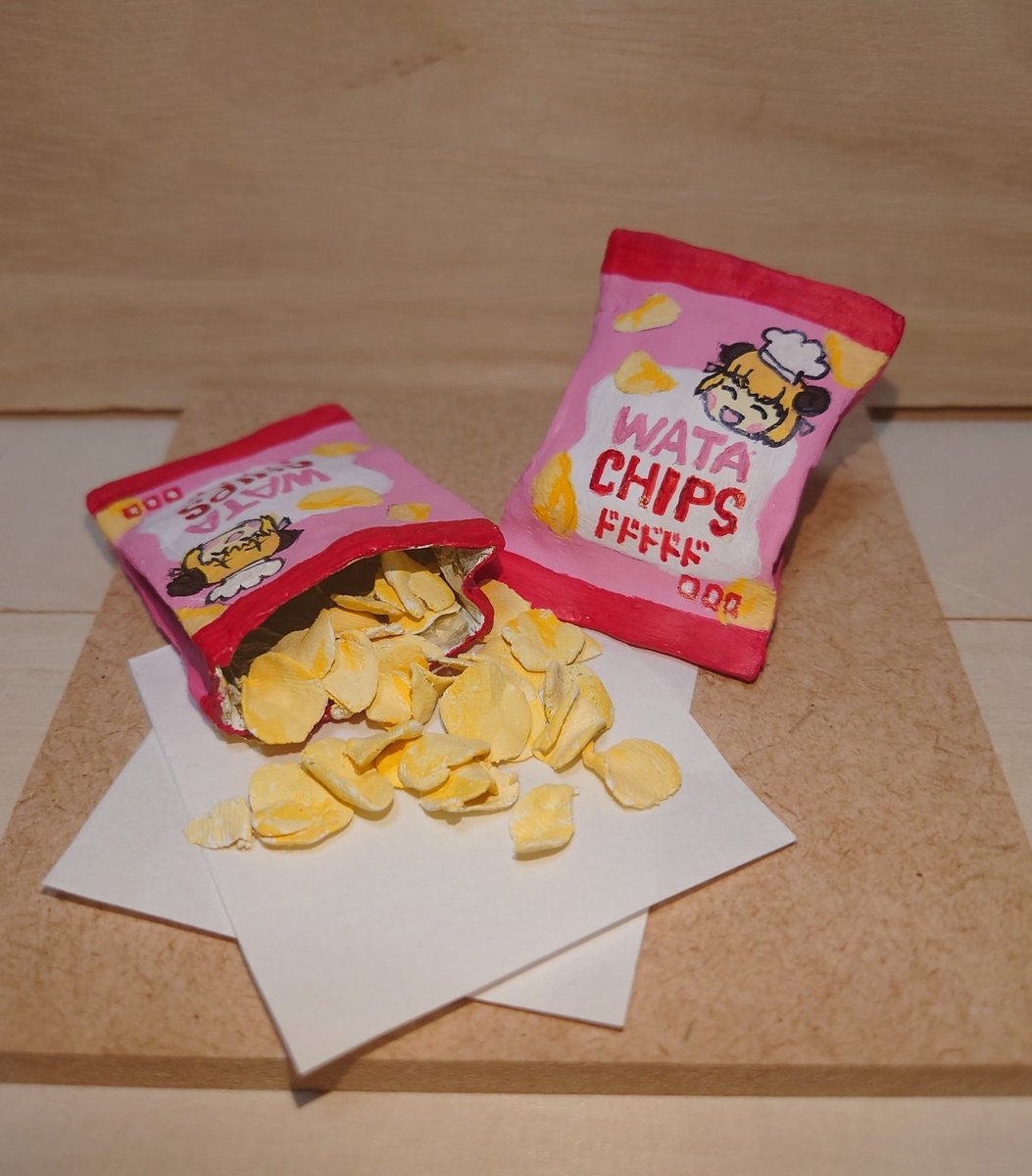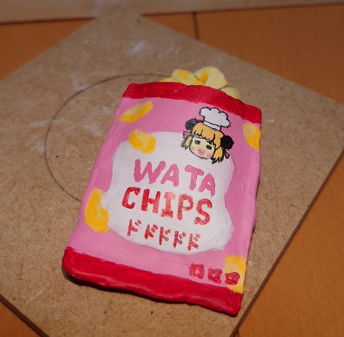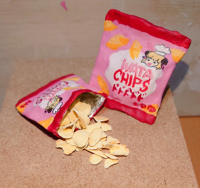 12 56 #つのまきあーと わためぇの超絶生誕祭からメン限まで観たテンションで色塗りしたワタチップスver.2と鶏ぽんさん👍 ワタチップスは文字を油性マジックと爪楊枝で前回よりハッキリクッキリ🫡 あーポテチの中身造ってない…コック帽わためぇ塗るのは明日かな🤔 次こそはマチもちゃんと造れる様に頑張る💪 22/06/07 01:50