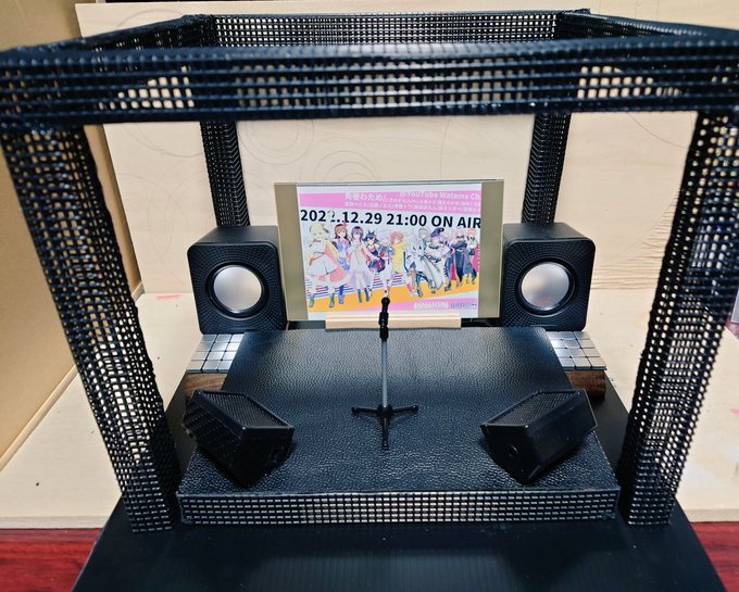 3 22 #つのまきあーと ライブ会場進捗第二弾🎤🎤 大枠は完成🤔グルーガン難しいね、柱ガタガタ(´ . .̫ . `) フロアモニターも片方カーボン調に変更👍サイズデカイわぁ(。ノω\。) 23/01/18 03:18