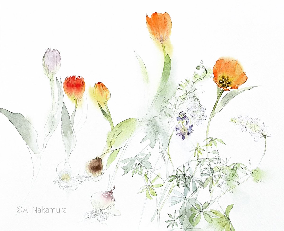 「チューリップと春の花」 #春の花 #透明水彩 #スケッチ