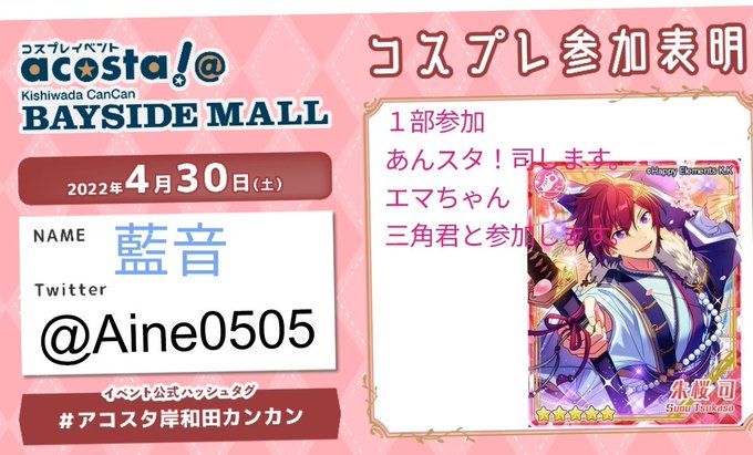 明日の岸和田カンカンに参加します。 1部久しぶりあんスタ!司君します! エマちゃんと三角君と一緒に参加してます。 #アコスタ岸和田カンカン