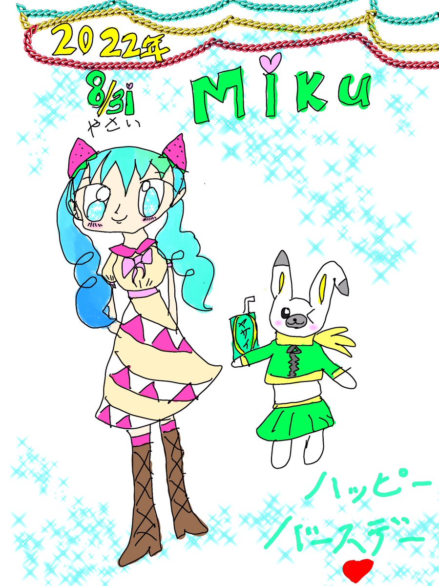 ミクちゃんお誕生日おめでとう🎉🎊🎂 娘のんのん(10)の誕生日イラスト😍 私は描けなかったから去年の過去絵で失礼😭💦ファン失格_(:3」z)_ #初音ミク生誕祭2021 #初音ミク誕生祭2021 #初音ミク
