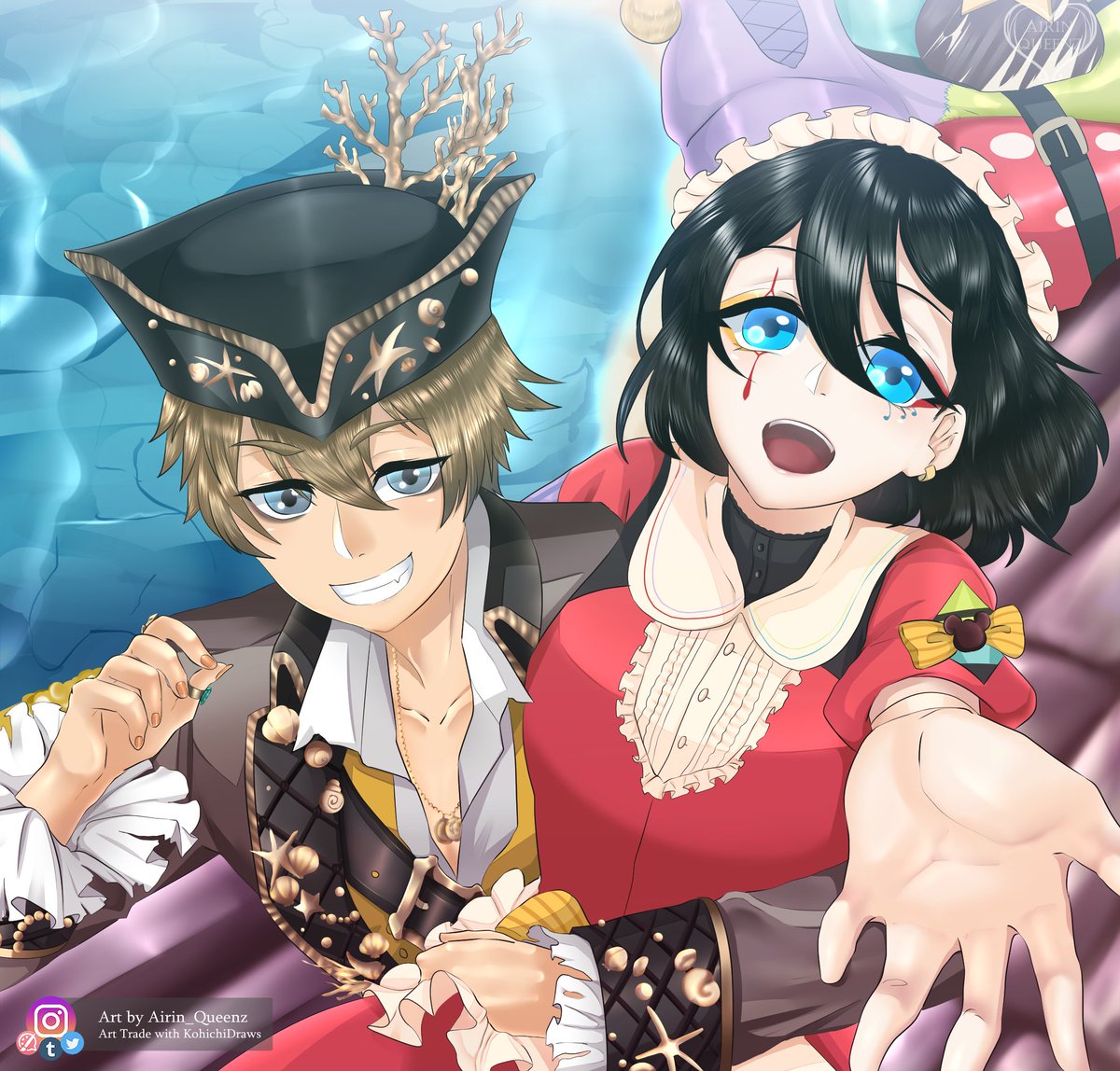 [This Artwork is done by Airin_Queenz. Please do not repost elsewhere.] This is a collab piece between me and @ibarahimechan of her oc and Vil. She did the sketch and i finalize it!(Line/color/bg) #Twistedwonderland #Twstプラス #ツイステファンアート