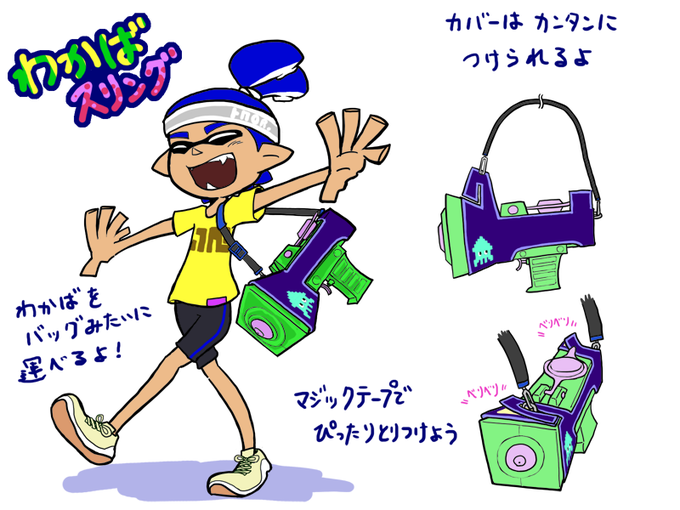 イカたちのブキケースその2。もはやケースすらないものも。わかばはカメラホルスターみたいなのをイメージして描きましたが難しい… #スプラトゥーン #Splatoon