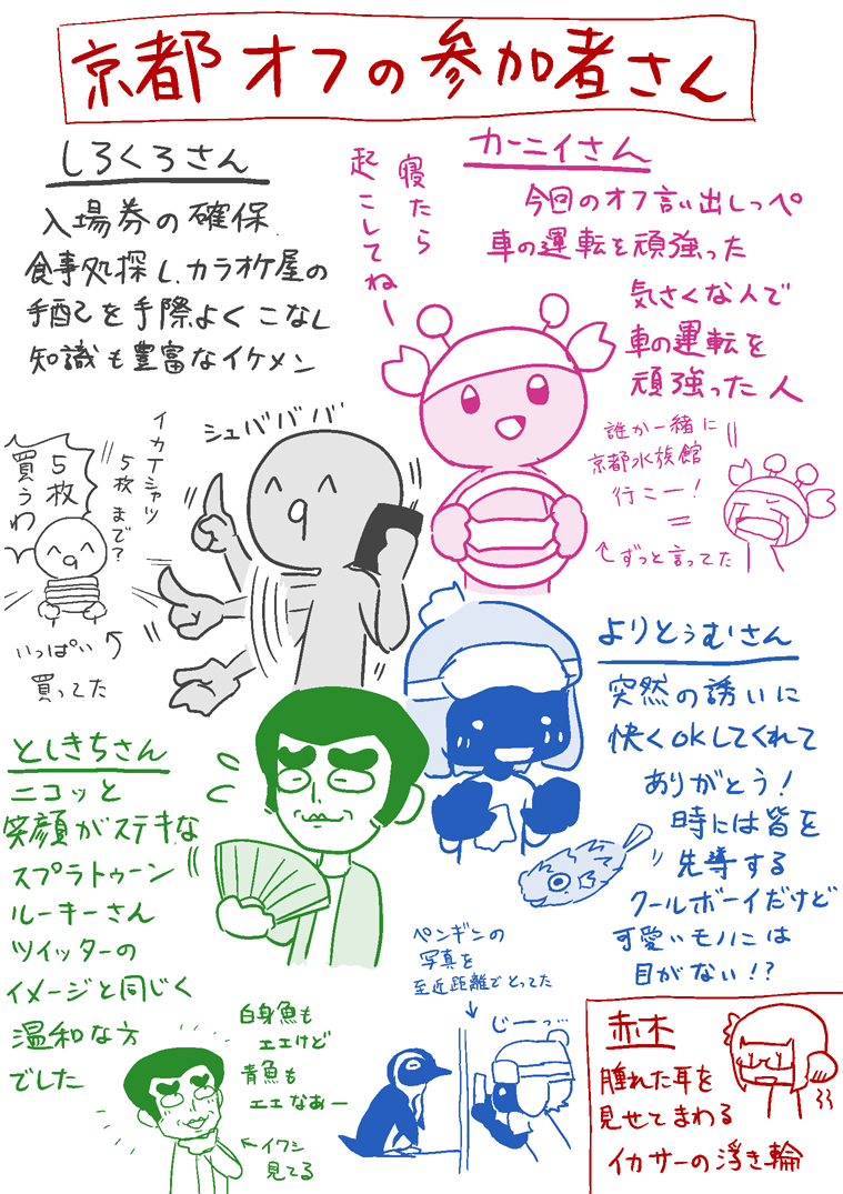 超絶今更なんですが…8月5日の京都オフのレポを描いてみました。 京都水族館に聖地巡礼にローカルサーモン!楽しかった! 読みづらいですが右から左へ読んで下さい。