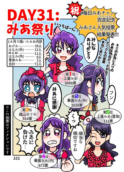 #毎日みあチャン DAY31(最終日)ってことでみあさん人気投票の結果発表!のべ72人のみあ(めぐを含む)を描ききりました!! 今まで沢山の反応ありがとうございました!みあに感謝!👆✨✨