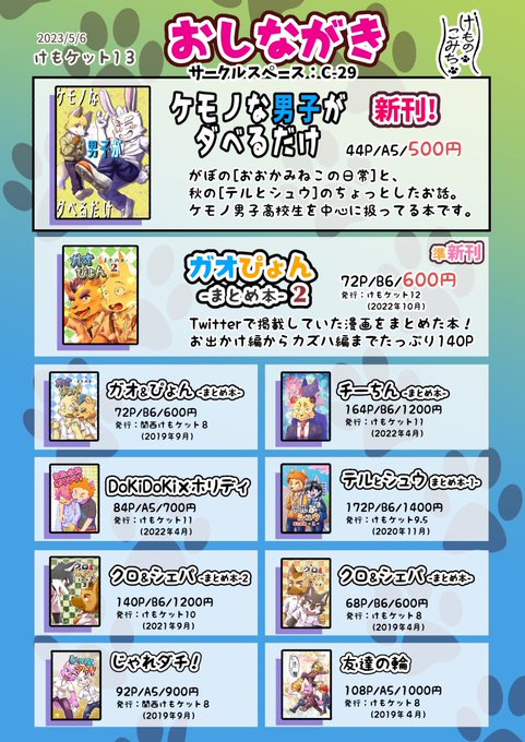 45 134 #けもケット13 新刊 C-29 けものこみち ケモノな男子がダベるだけ A5 / 44P / 500円 いつも通りのケモノ男子学生をメインとした本です。主にケモDK。 ゆるい日常マンガって感じでーす! 今回は薄め!良ければで〜!!🙌 #けものこみち 23/05/04 00:04