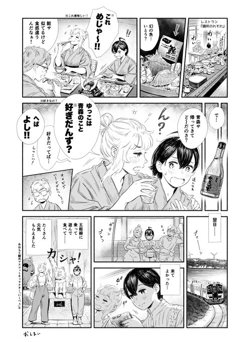 「リゾートしらかみで行く五能線の旅」2回目の投稿です。 リゾートしらかみには半個室タイプ、大型テーブル装備のボックスシートも連結されています。 是非、お出かけの際は津軽のうめもの(美味しいもの)とご一緒に! #漫画が読めるハッシュタグ #ツガルツナガル #温泉サいこう 漫画:@inuhiko2016