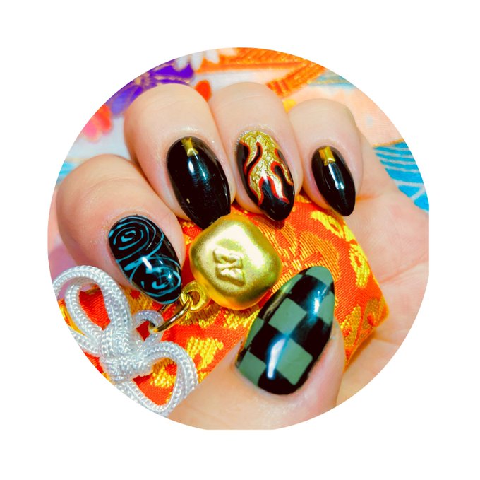 「なんか、個性的ですね」てギャルネイリストが困りながらしてくれた🔥💧 気分かえて今回ちょっと短め~ そろそろオタバレしそう(´^q^`) 煉炭イメージおニューネイル💕