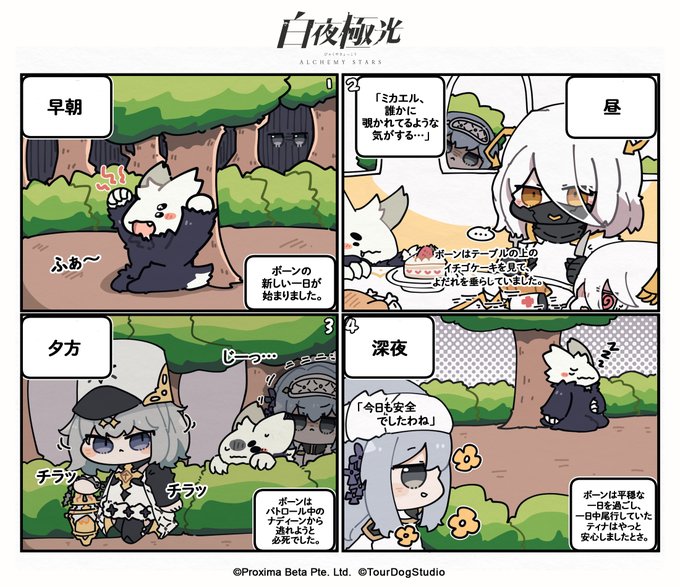 【ボーンを見守る影】 物影から感じる視線、闇にちらつく気配… だが、振り返ってみると、誰もいない… もしかして、新たな暗潮の前触れ? いいえ! それはボーンを守護するティナの姿! 今日もしっかりボーンを見守っているようですね😊 #白夜極光 #びゃくやきょっこう