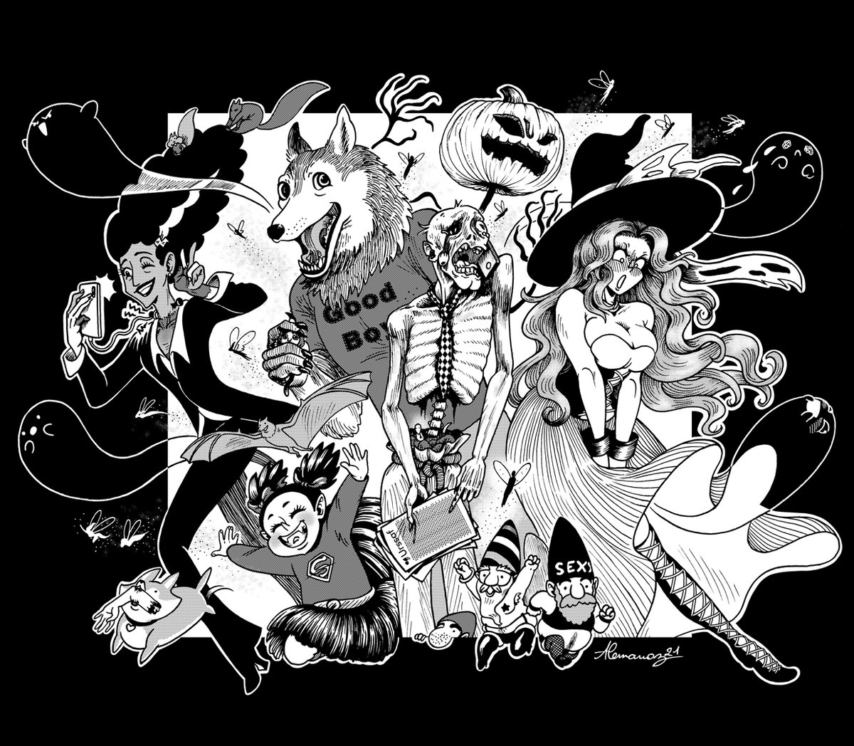 🎃 Halloween !! 🎃 Cinquième et dernier #inktober2021 !! 🎉🍭 GG à tout le monde pour ce super mois !💪 J'ai vraiment adoré faire ce challenge et tester plein d'idée et techniques ! 🙏 Tout à droite une des sorcières designées par @Vel_kia merci de me l'avoir prêté ! 😘
