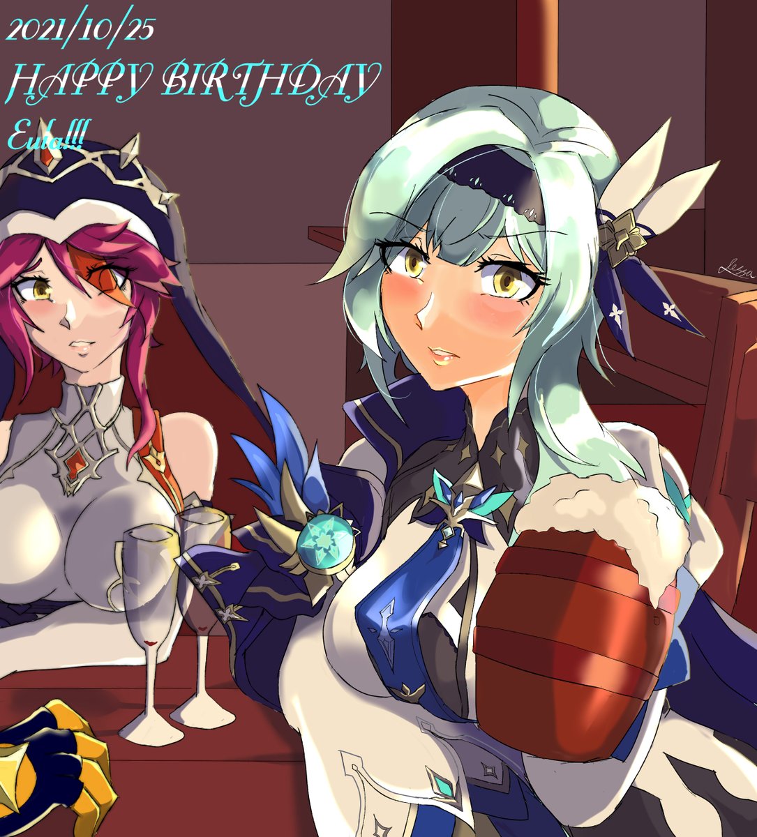 #エウルア生誕祭2021 #Eula 「全く...今日に限って遅れてくるなんてどういうつもり?意図的なら復讐するわよ」 同席している二人(今日貸し切りにするために旅人が走り回った事知らないんだな...) 今日くらいはどうか、嫌なこと穏やかに過ごしてくれ...誕生日おめでとう...