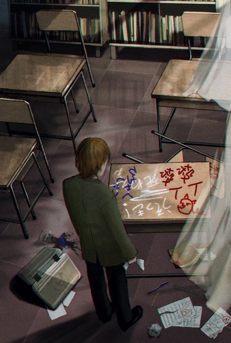 ...Akechi stops dead at the door; his desk has been vandalized, notes and stationery wiped off, scatter on the floor, his attaché case flipped inside out. Across the desk, color chalks spell out "Murderer!", "Liar", "Bastard child". Well, at least you lived. #明智吾郎誕生祭2020