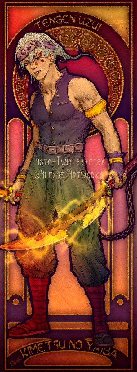 ๐ต Tengen Uzui from #kimetsunoyaiba in Art Nouveau style! ๐ต Available on Etsy too. #kimetsunoyaibafanart #demonslayerfanart #tengenuzui #uzuitengen